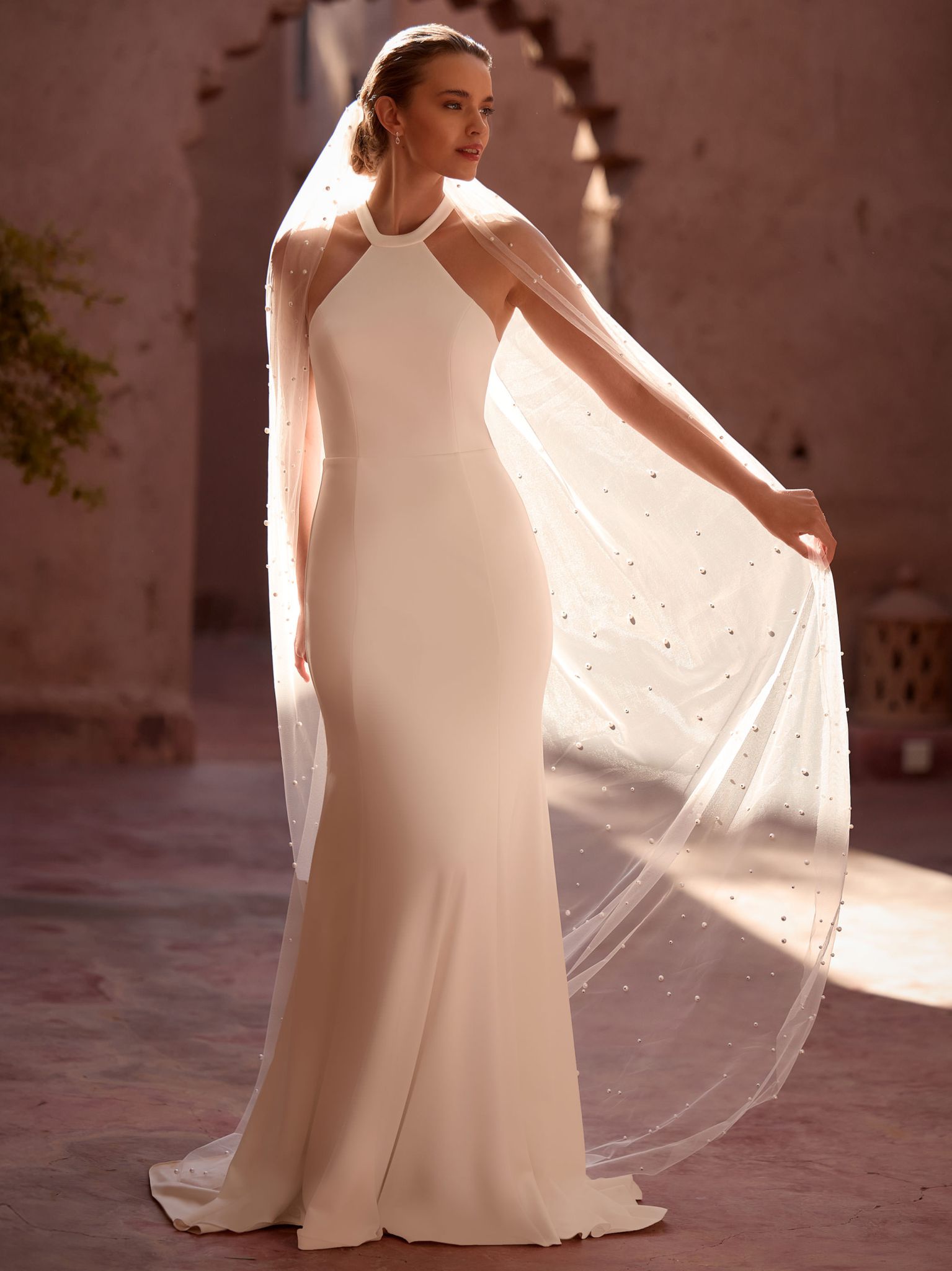 Feiner Brautschleier aus reinem, weichem Tüll mit sanftem Fall. Das einlagige Design und die zarte geschnittene Kante verleihen ihm eine moderne, klare Optik. Zarte runde Perlen schmücken den Schleier dezent und setzen edle Akzente. Mit einer Länge von 200 cm rundet er das Brautoutfit stilvoll ab.