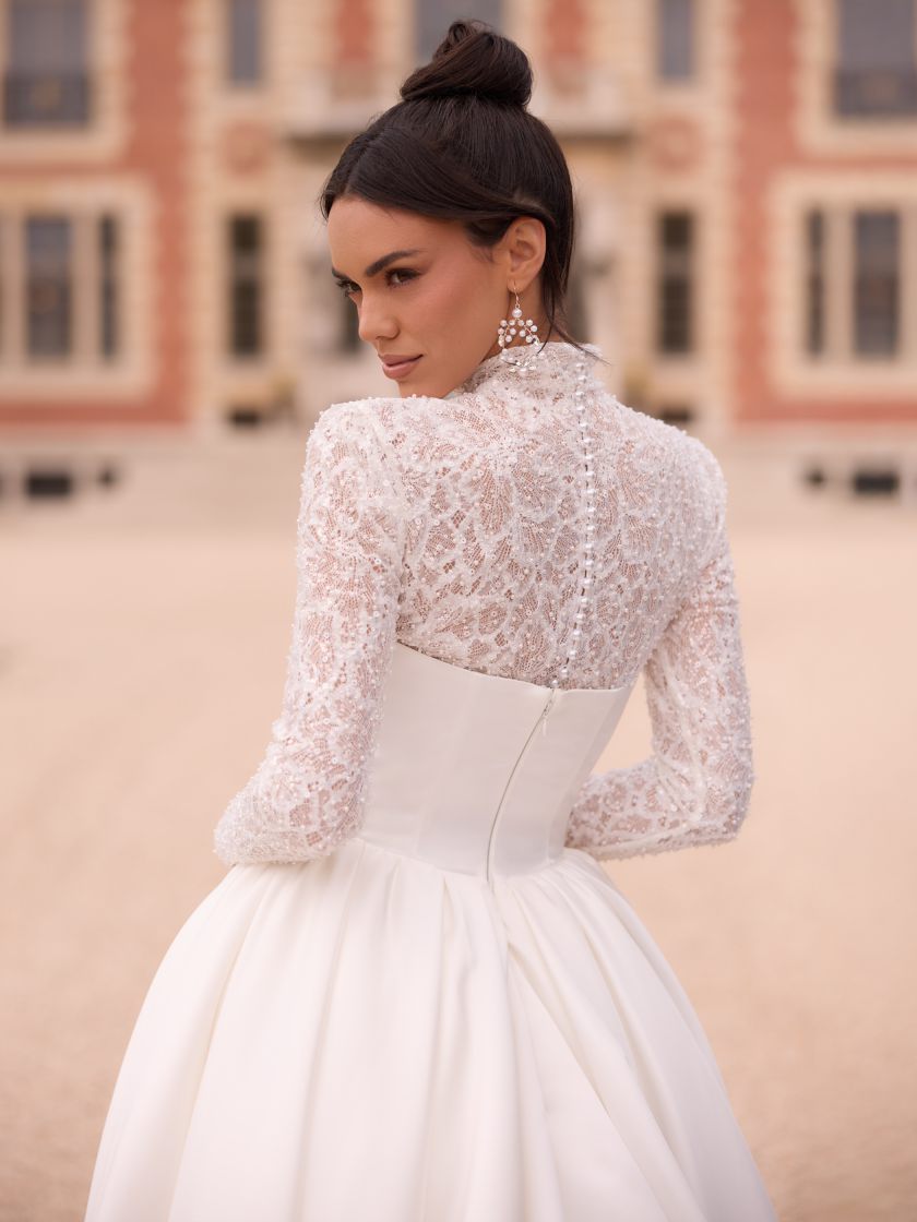 Modern, klar, selbstbewusst: Dieses bodenlange Ballkleid aus edlem Mikado-Satin betont eine elegante Basquen-Taille und setzt mit geradem Rückenausschnitt ein ausdrucksstarkes Statement. Das trägerlose Dekolleté und die Korsettstruktur verleihen dem Look feminine Raffinesse. Die majestätische Schleppe rundet das Design harmonisch ab. Der Rücken schließt mit einem Reißverschluss. Ideal für feierliche Trauungen, klassische Hochzeiten oder elegante Galaveranstaltungen.