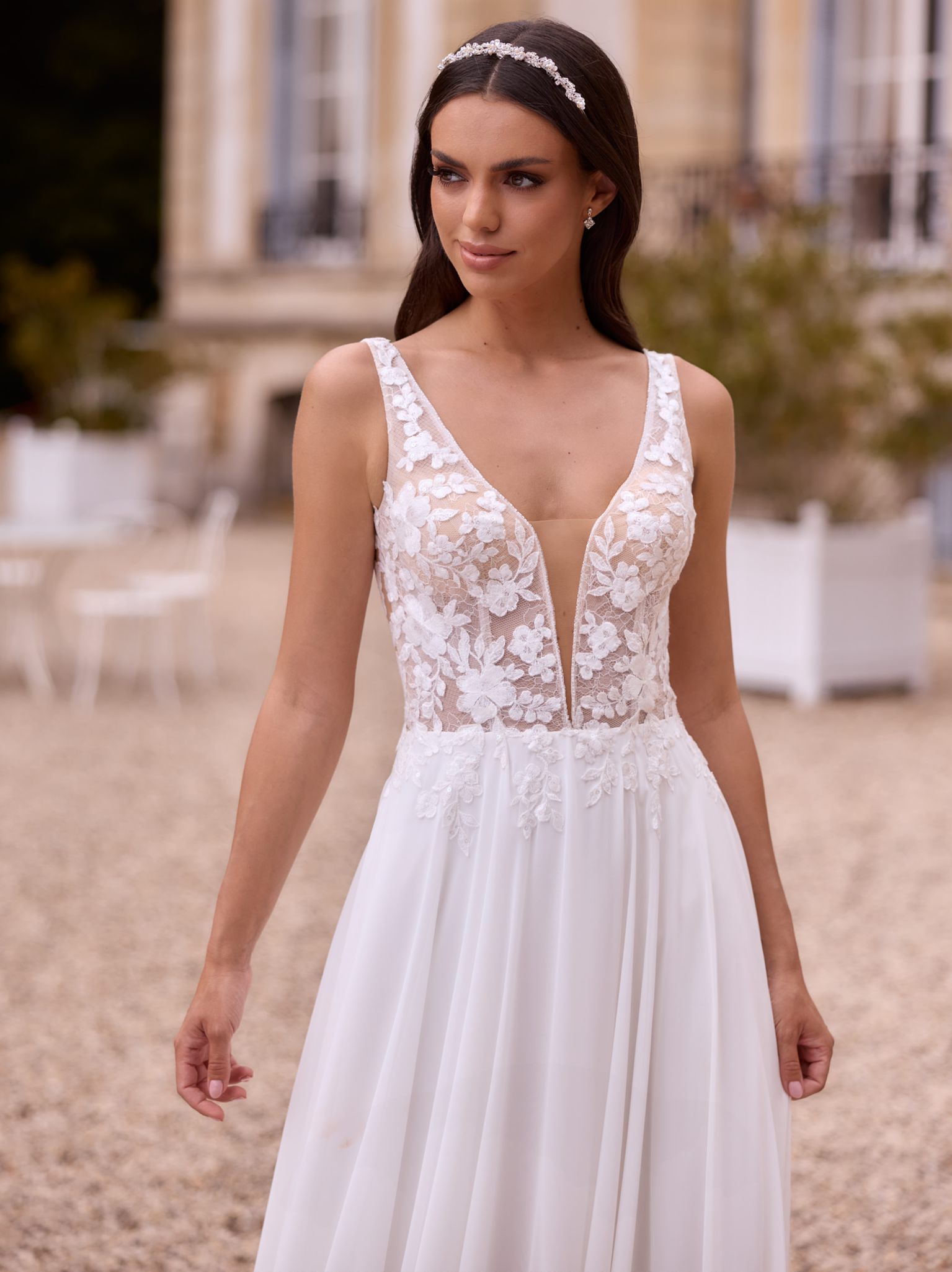 Modern, klar, selbstbewusst: Dieses bodenlange Boho-A-Linien-Brautkleid aus feiner Baumwollspitze mit floralem Muster und fließendem Chiffon betont eine natürliche Taille und setzt mit rundem Illusion-Rücken ein zartes Statement. Der feminine V-Ausschnitt und die elegante Schleppe verleihen dem Design eine harmonische Leichtigkeit. Der Rücken schließt mit einem Reißverschluss und Knöpfen. Ideal für Boho-Hochzeiten, Sommertrauungen im Freien oder romantische Gartenfeiern.