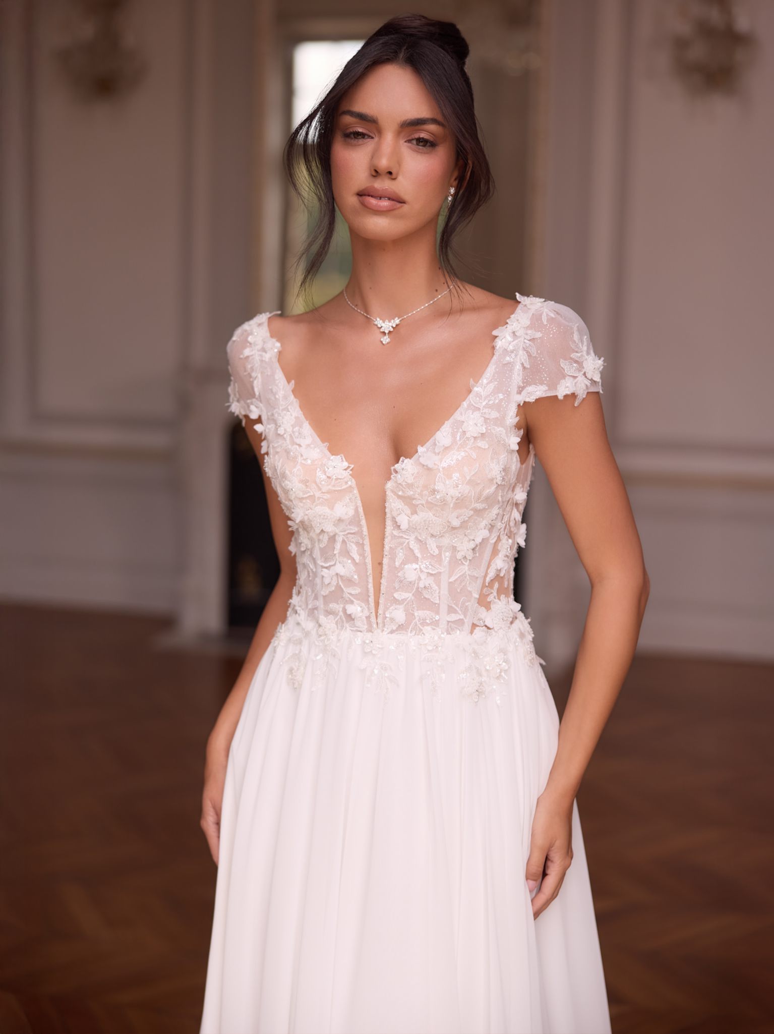 Modern, klar, selbstbewusst: Dieses bodenlange Boho-A-Linienkleid aus hochwertigem Chiffon und Spitze betont eine natürliche Taille und setzt mit tiefem V-Rücken ein elegantes Statement. Der V-Ausschnitt und die kurzen Cap-Ärmel schaffen eine feminine Silhouette. Das Oberteil ist aufwendig bestickt und mit 3D-Blumenspitze veredelt. Eine lange Schleppe verleiht dem Kleid royalen Charakter. Der Rücken schließt mit Reißverschluss, akzentuiert durch dekorative Knöpfe. Ideal für Boho-Hochzeiten, freie Trauungen oder sommerliche Festlichkeiten.