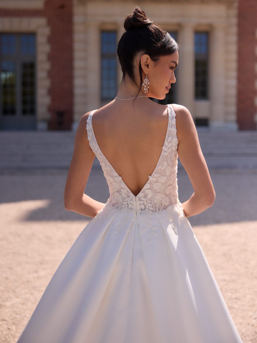 Modern, klar, selbstbewusst: Dieses bodenlange Braut-Ballkleid aus hochwertiger Spitze und mattem Satin betont eine natürliche Taille und setzt mit tiefem V-Rückenausschnitt ein elegantes Statement. Der V-Ausschnitt und das ärmellose Design erzeugen eine zeitlose Silhouette. Bestickte Kristallblumen auf dem Oberteil, ein eleganter Frontschlitz und praktische Taschen verbinden königlichen Stil mit moderner Funktionalität. Die lange, fließende Schleppe verleiht dem Kleid majestätische Präsenz. Der Rücken schließt mit einem Reißverschluss. Ideal für klassische Zeremonien, repräsentative Empfänge oder festliche Abendveranstaltungen.