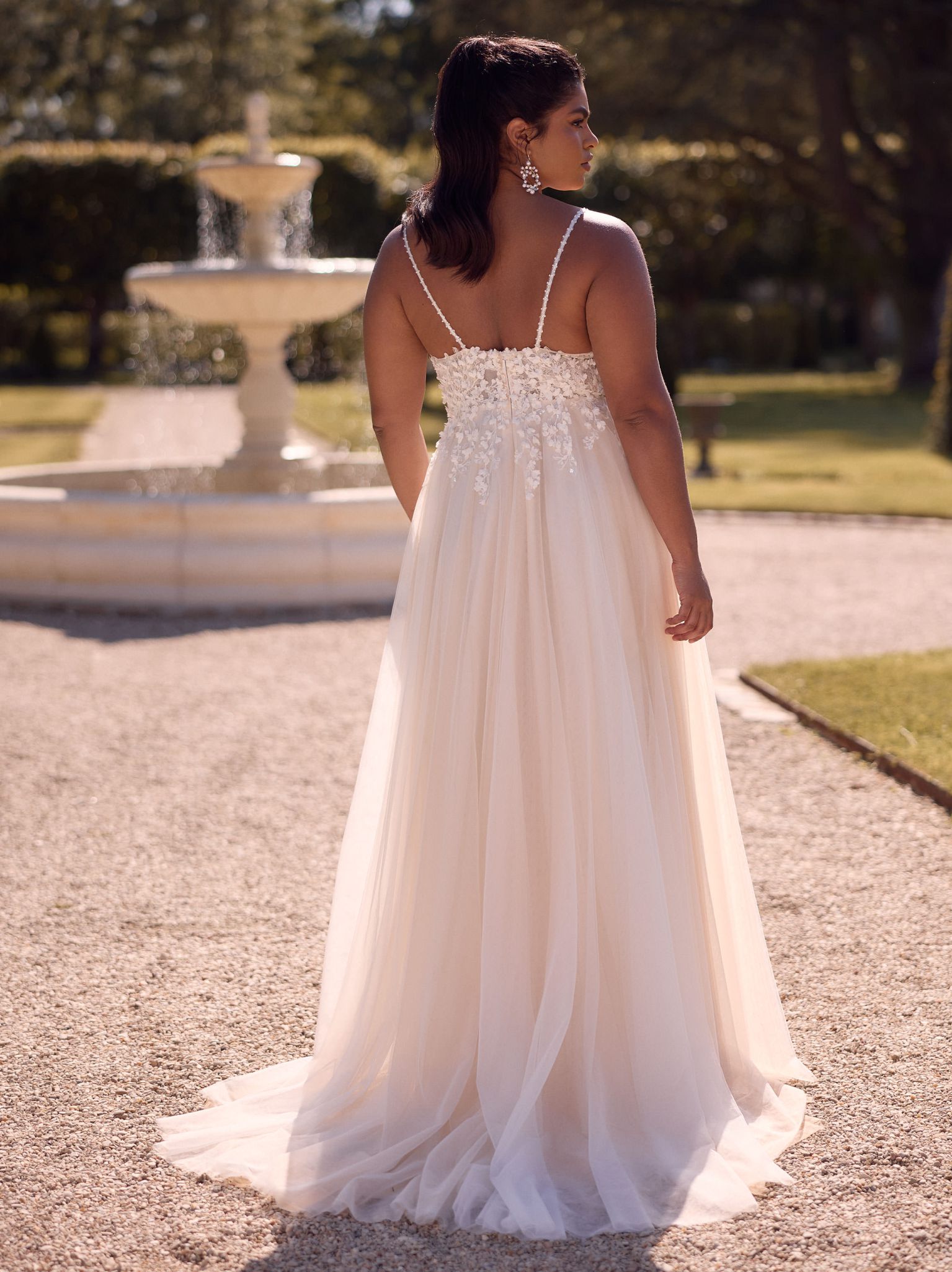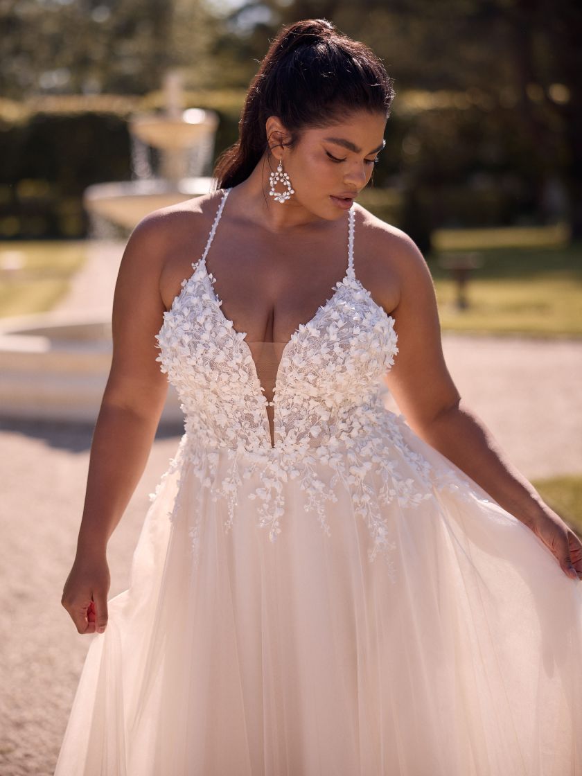 Modern, klar, selbstbewusst: Dieses bodenlange Brautkleid aus edler Spitze und feinem Tüll betont eine natürliche Taille und setzt mit offenem Rücken ein elegantes Statement. Das Sweetheart-Dekolleté und die zarten Spaghettiträger verleihen dem Design Leichtigkeit. Der Rücken schließt mit einem Reißverschluss. Ideal für klassische Trauungen, romantische Gartenhochzeiten oder festliche Abendfeiern.