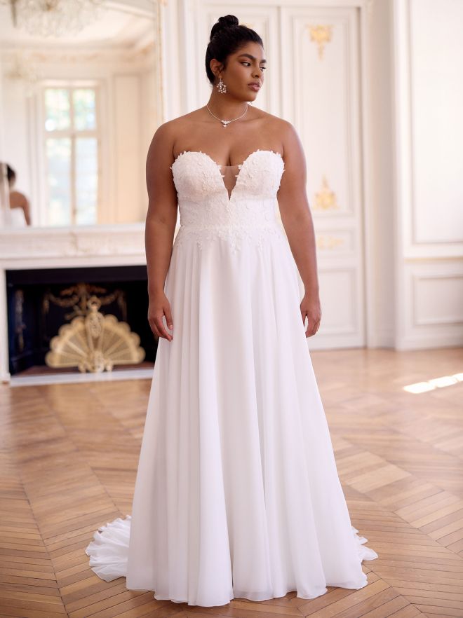 Modern, klar, selbstbewusst: Dieses bodenlange Brautkleid aus edlem Mikado betont eine natürliche Taille und setzt mit offenem Rücken ein stilvolles Statement. Der herzförmige Ausschnitt und der voluminöse Faltenrock verleihen dem Look klassische Eleganz. Der Rücken schließt mit einem Reißverschluss und feinen Knöpfen. Ideal für feierliche Trauungen, elegante Hochzeitszeremonien oder den großen Auftritt am Abend.