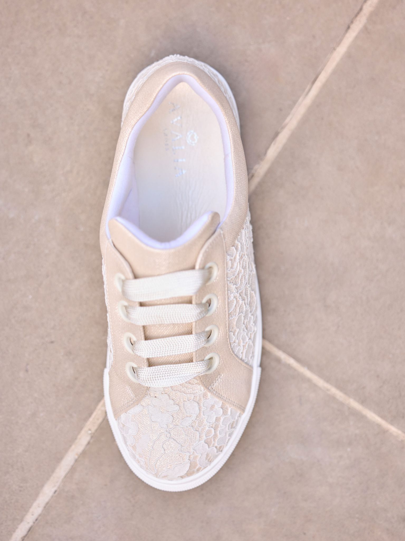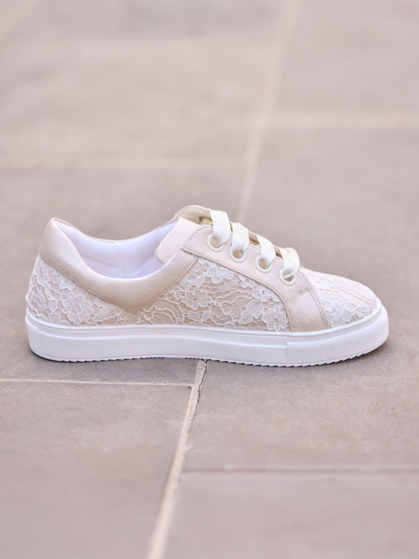 Modern, klar, selbstbewusst: Dieser Braut-Sneaker aus feiner Spitze und strapazierfähigem synthetischem Material verbindet Stil und Komfort. Ideal, um nach einem langen Tag entspannt weiterzufeiern, ohne auf Eleganz zu verzichten. Die weiche Schaumstoff-Innensohle sorgt für höchsten Tragekomfort – perfekt für die Hochzeitsnacht oder den zweiten Look am Abend.