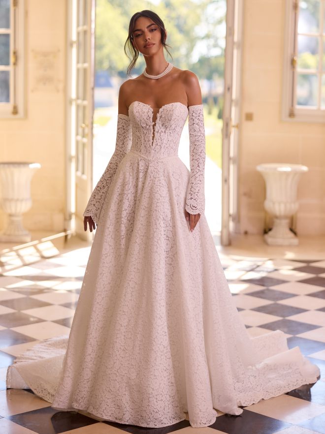 Modern, klar, selbstbewusst: Dieses bodenlange Prinzessinnen-Brautkleid aus edler Spitze und funkelndem Kristalltüll betont eine natürliche Taille und setzt mit transparentem V-Rückenausschnitt ein luxuriöses Statement. Der V-Ausschnitt mit Illusion-Effekt und das ärmellose Design unterstreichen die moderne Eleganz. Handgestickte Spitzendetails und eine prachtvolle, vollständig bestickte Schleppe verleihen dem Look royale Ausstrahlung. Der Rücken schließt mit einem Reißverschluss. Ideal für klassische Schlossfeiern, festliche Trauungen oder elegante Hochzeitszeremonien.